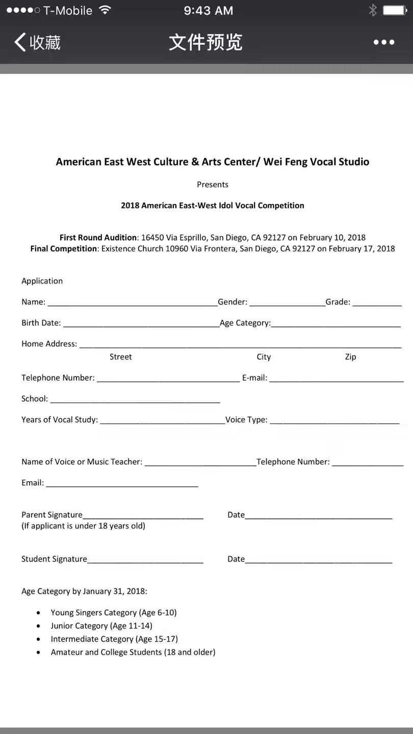 2) Love singing? 2018 American East-West Vocal Idol Competition is coming for you. Application is accepted through January 31, 2018! See attachment here (1, 2). The competition is hosted by our dear vocal teacher, Ms Wei Feng. Please contact Feng Laoshi for further question: This email address is being protected from spambots. You need JavaScript enabled to view it. .