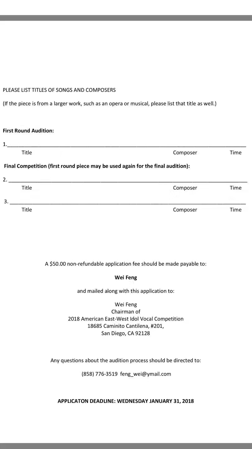 2) 2018 American East-West Vocal Idol Competition is accepting application till January 31, 2018! Information and application form are attached here (1, 2). The competition is hosted by our dear vocal teacher, Ms Wei Feng, who won First Place in professional singers' Broadway/Musical Theatre Category of American Protege International Vocal Competition 2017! If you love singing, join us!