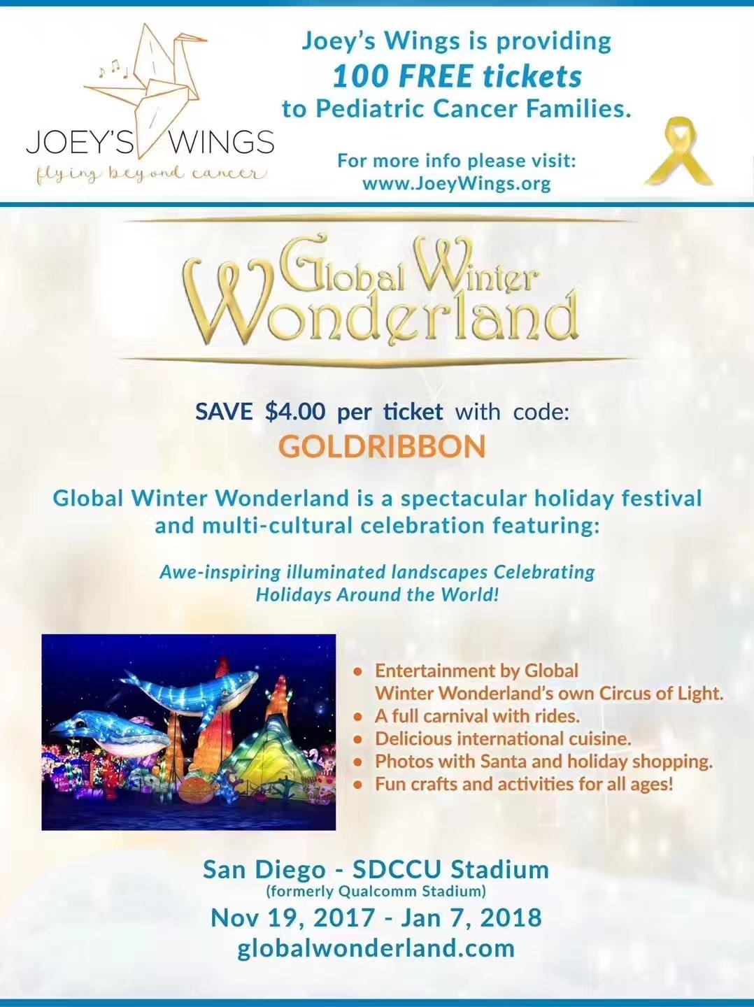 3) Jingle bell! Jingle bell! Global Wonderland holiday light show is here in San Diego for the first time! Beautiful lights, wonderful rides, delicious food, for all ages. Must see! Tickets available in the office this Sunday, $18/$15 adult/children admission ($4 more at the gate), $18 all rides ($36 at the gate)! flyer attached (1, 2).