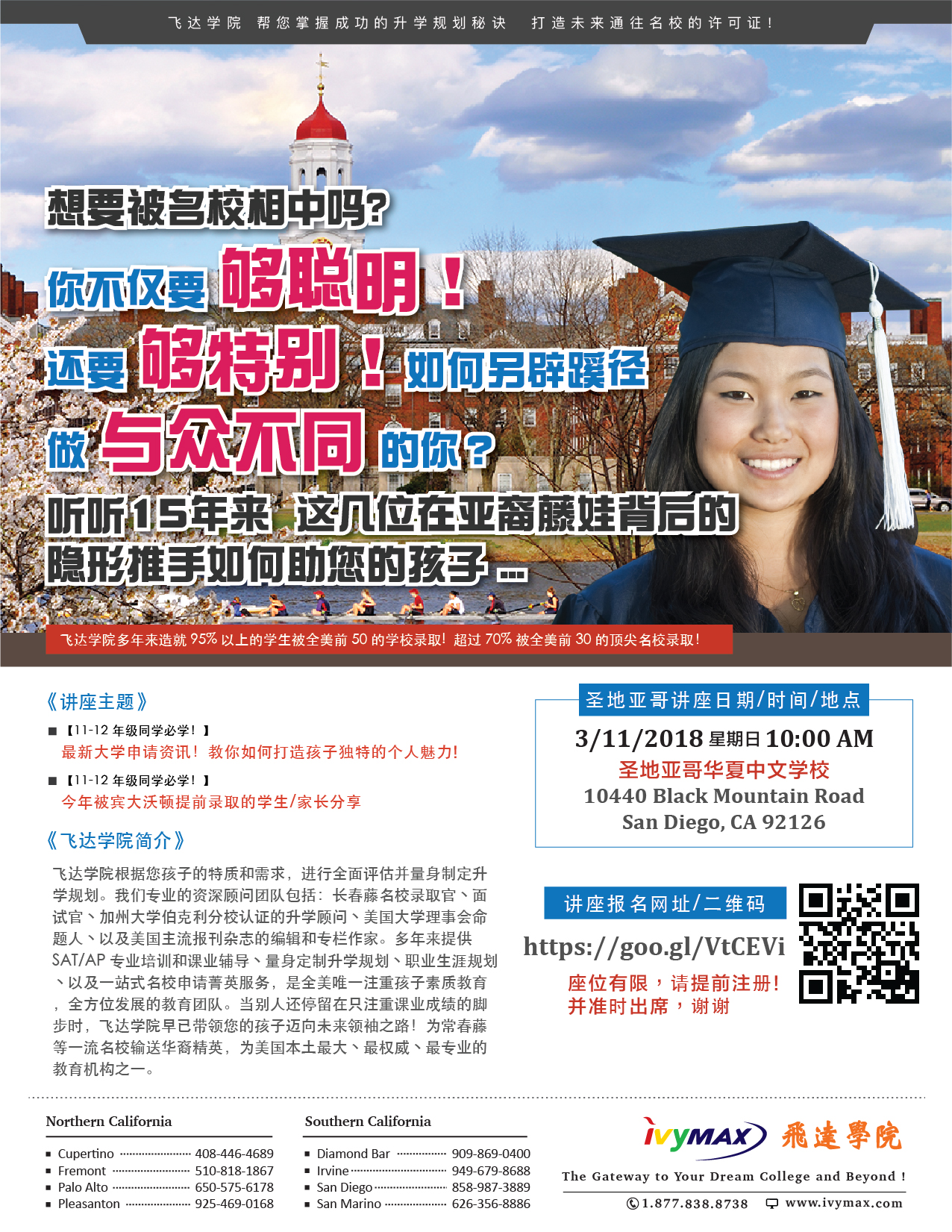 3) College application counseling! Ivymax (飞达学院) will host a seminar on March 11, at A-110, 10:00 - 12:00. Pre-registration required. See attached flyer for QR code.