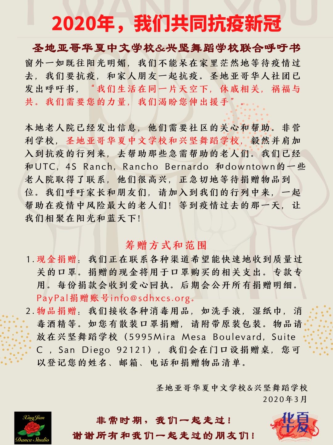 While San Diego Chinese American community is fighting COVID-19 alongside all San Diegans, SDHXCS and Xingjian Dance Studio are fundraising to help our local Senior Homes & the doctors and nurses in local hospitals. We have delivered thousands of facemasks and hand sanitizers to senior homes in UTC, 4S Ranch, Rancho Bernardo, Scripps Ranch, and Carlsbad areas. We also ordered isolation gowns, face shields, and goggles to support doctors’ and nurses’ personal protection. Please join us helping them with your generous donation. Both cash (Paypal to This email address is being protected from spambots. You need JavaScript enabled to view it. or check payable to SDHXCS) and sanitizing products are accepted. Please see the attached flyer for details. Or you can email me should you have any questions This email address is being protected from spambots. You need JavaScript enabled to view it. . Thank you for your Love, Care, and Support!