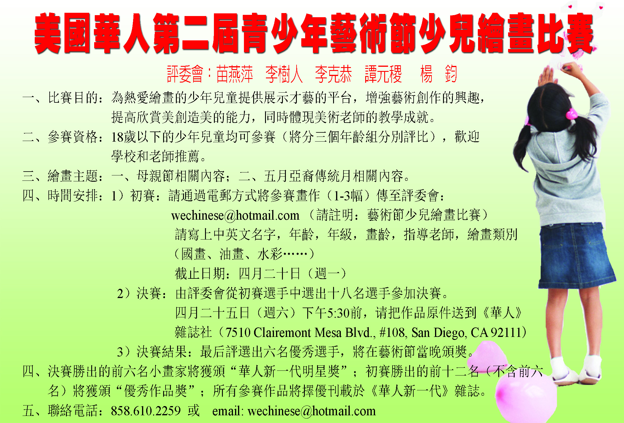 4) The  American Chinese Youth Art Festival - Painting/Drawing Contest application Deadline 4/20See flyer for details.